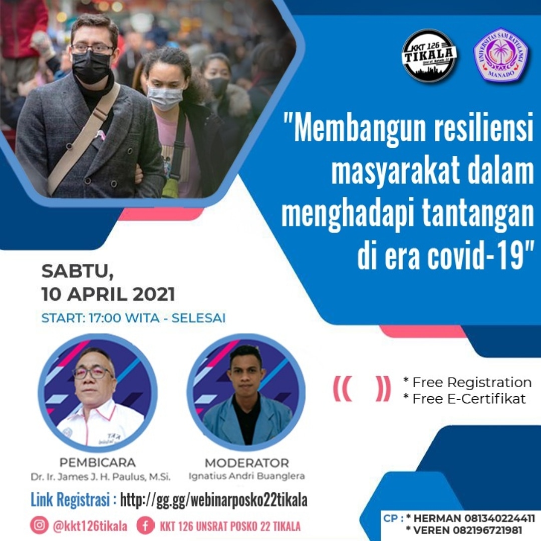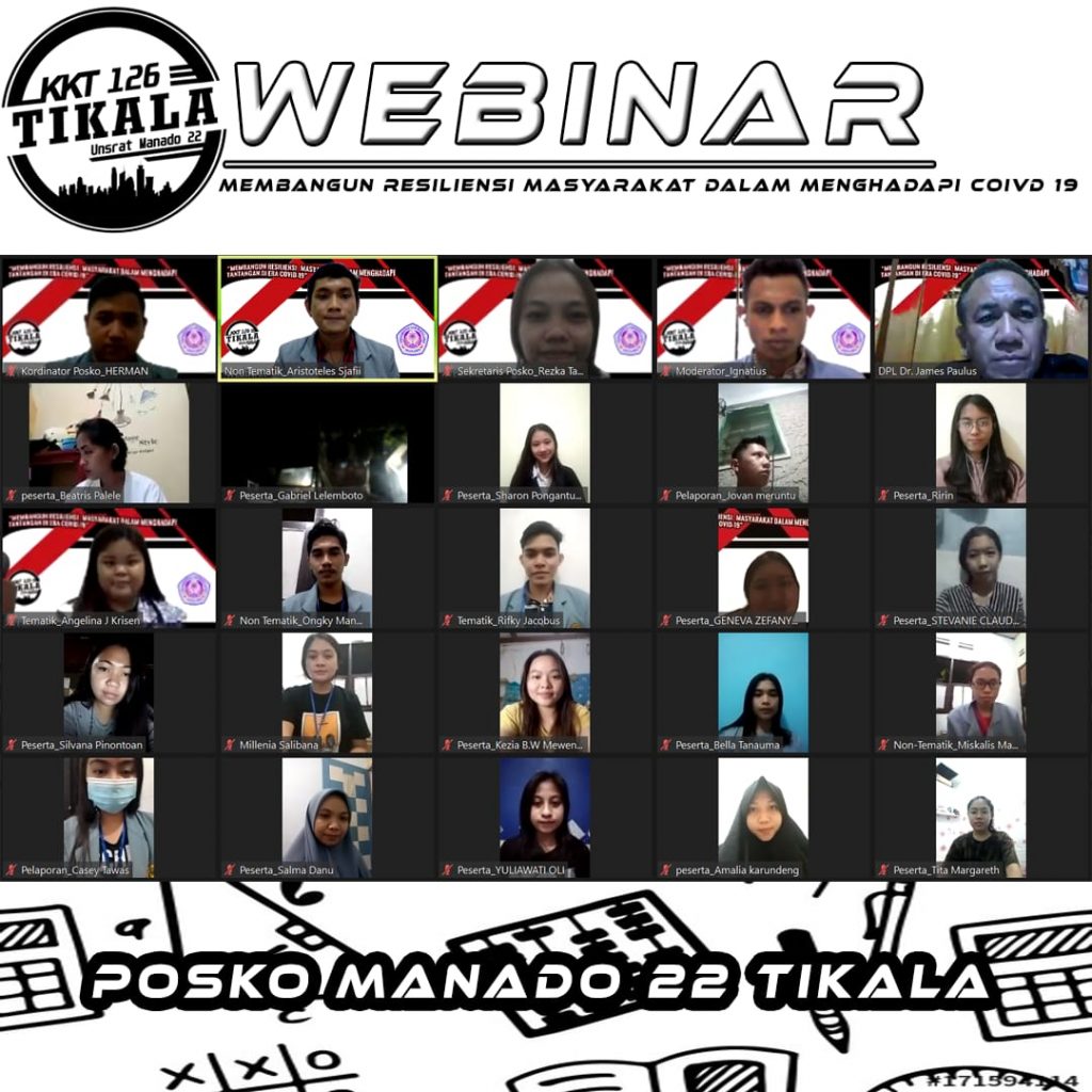 Petasulut.com, MANADO – KKT126 Universitas Sam Ratulangi Manado Posko 22 Tikala mengadakan kegiatan webinar dengan mengangkat tema “Membangun resiliensi masyarakat menghadapi tantangan di era covid 19” Jumat,10/04/2021.