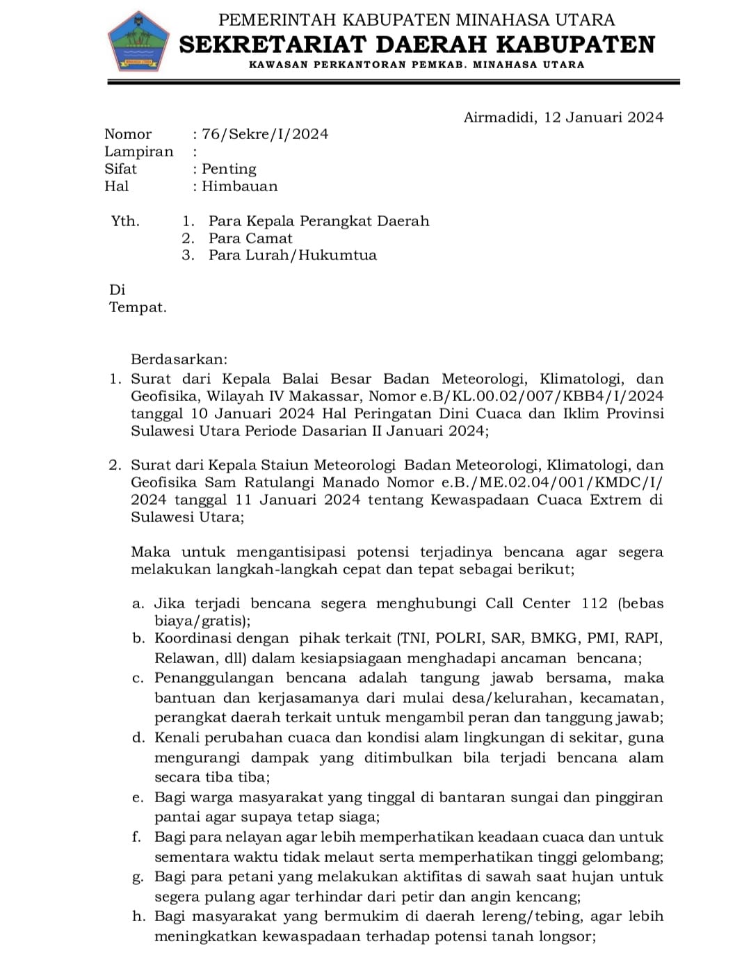 Begitupun juga, Surat dari Kepala Staiun Meteorologi Badan Meteorologi, Klimatologi, dan Geofisika Sam Ratulangi Manado Nomor e.B./ME.02.04/001/KMDC/1/ 2024 tanggal 11 Januari 2024 tentang Kewaspadaan Cuaca Extrem di Sulawesi Utara.