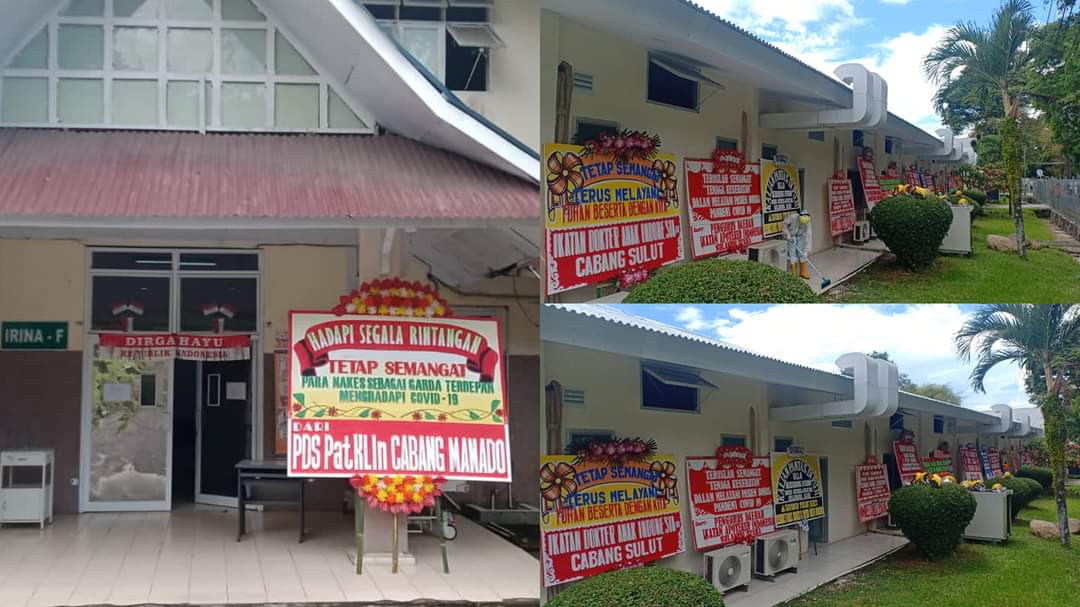 Ratusan karangan bunga terpampang di sekitar Gedung Irina F dan Gedung Palma tempat perawatan pasien covid 19 yang berisi dukungan dan motivasi agar para nakes tetap semangat berjuang di tengah peningkatan kasus covid 19 bahkan sorotan yang disuarakan masyarakat.
