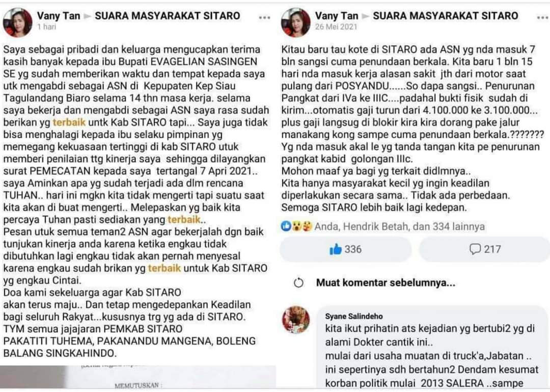 Saya sebagai pribadi dan keluarga mengucapkan terima kasih banyak kepada ibu Bupati EVAGELIAN SASINGEN SE yg sudah memberikan waktu dan tempat kepada saya utk mengabdi sebagai ASN di Kepupaten Kep Siau Tagulandang Biaro selama 14 thn masa kerja. selama saya bekerja dan mengabdi sebagai ASN saya rasa sudah berikan yg terbaik untk Kab SITARO tapi… Saya juga tidak bisa menghalangi kepada ibu selaku pimpinan yg memegang kekuasaan tertinggi di kab SITARO untuk memberi penilaian ttg kinerja saya sehingga dilayangkan surat PEMECATAN kepada saya tertanggal 7 April 2021..