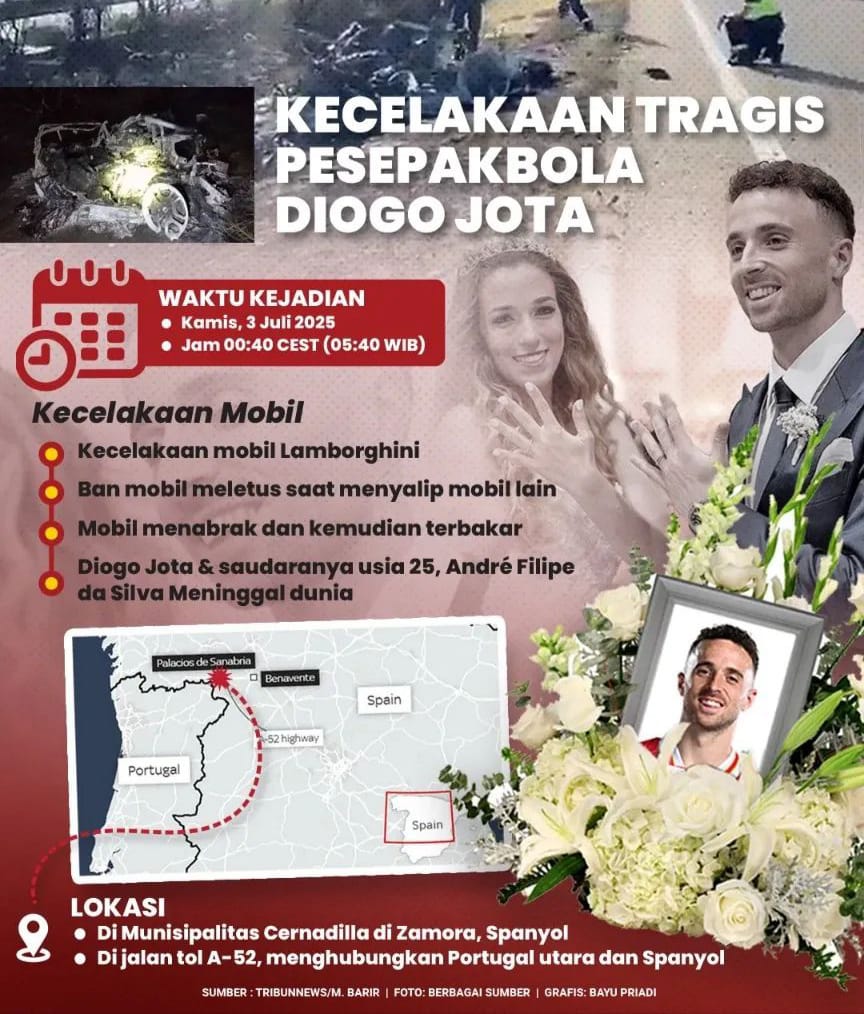 Dilansir dari Sky Sports bahwa kecelakaan mobil yang menewaskan Diogo Jota dan adiknya, Andre Silva, terjadi pada Kamis pukul 00.30 dini hari di region Cernadilla, Zamora, Spanyol.