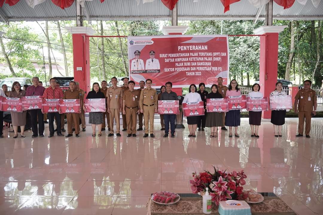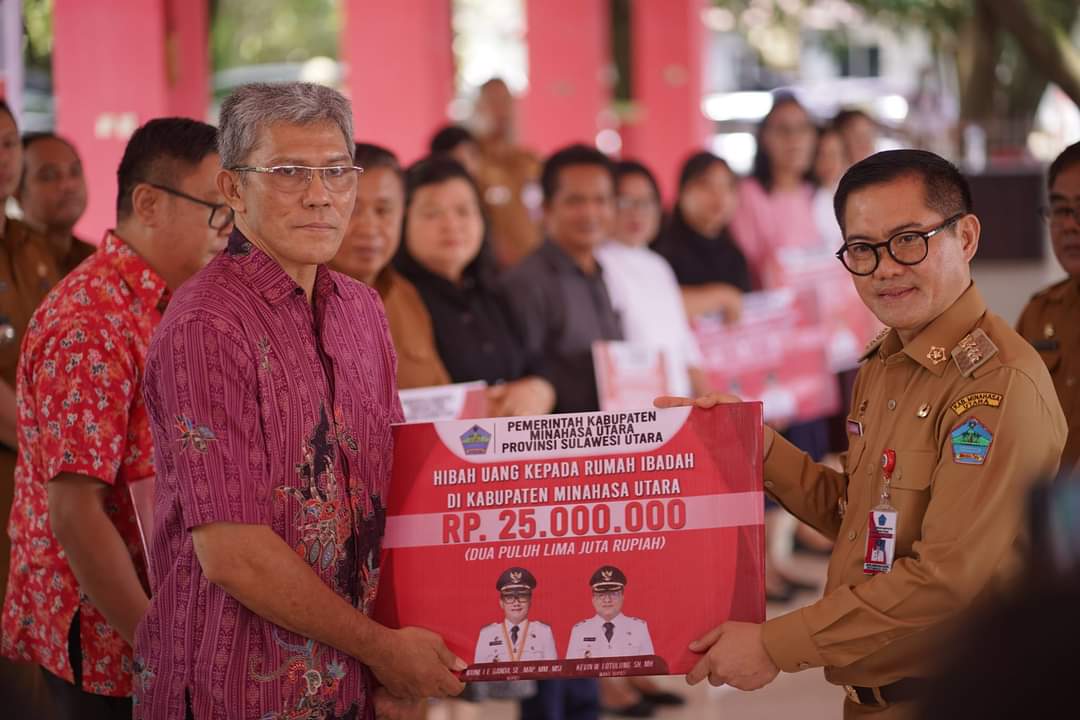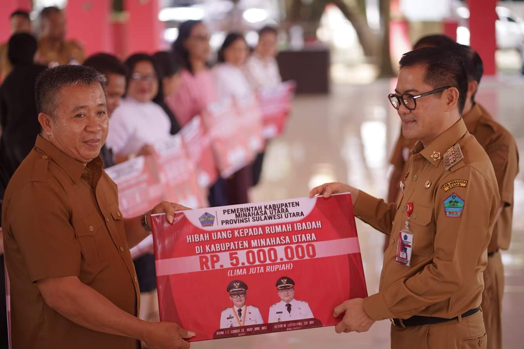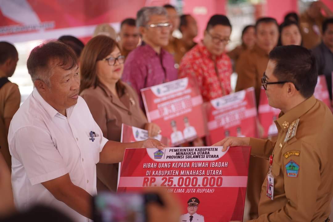 Petasulut.com, MINUT – Bupati Minahasa Utara Joune Ganda, Senin (26/06/2023) menyerahkan dana hibah tempat ibadah Kabupaten Minahasa Utara TA 2023.