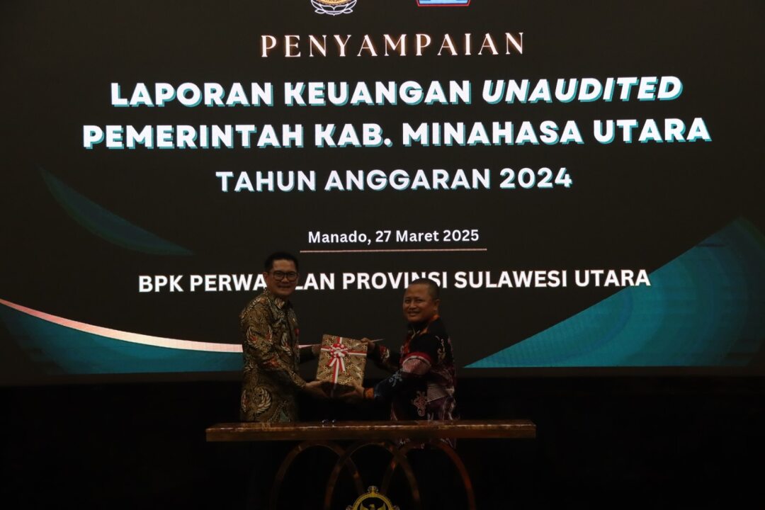 Bupati Minahasa Utara (Minut) Joune Ganda pun menyerahkan LKPD “Unaudited” tahun 2024 yang diterima langsung oleh Kepala BPK Perwakilan Provinsi Sulut, Bombit Agus Mulyo.