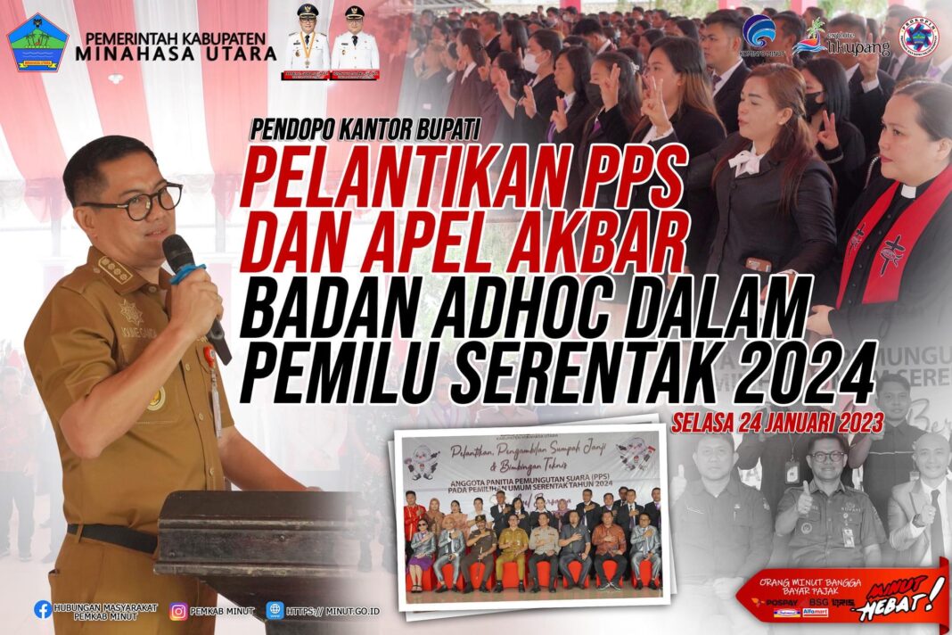 Petasulut.com, MINUT – Apel Akbar Badan Adhoc untuk Pemilu Serentak 2024 diikuti sebanyak 393 anggota Panitia Pemungutan Suara (PPS), Selasa (24/01/2023) bertempat di pendopo Kantor Bupati Minut.