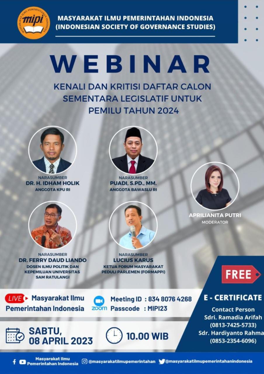 Petasulut.com, UNSRAT – Dalam webinar bertajuk ‘Kritisi Daftar Calon Sementara DPR/DPRD Pemilu 2024 yang digelar Masyarakat Ilmu Pemerintahan Indonesia (MIPI), Sabtu (08/03/2023) terungkap bahwa Pemilu 2019 belum memberikan hasil positif sebagaimana ekspetasi publik.