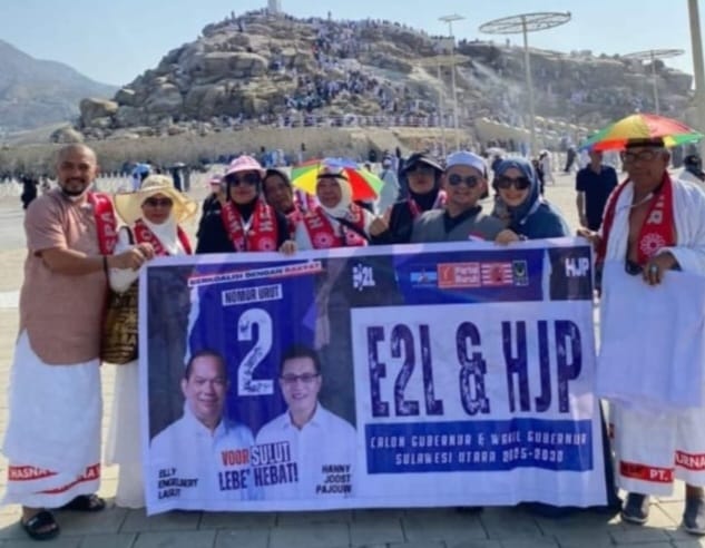 Dukungan E2L-HJP juga datang dari tanah suci Mekah, di mana baliho pasangan calon ini dikibarkan oleh jemaah haji asal Kotamobagu. Ini menjadi simbol kecintaan dan harapan masyarakat akan keberhasilan pasangan ini, dengan doa-doa dari tanah suci yang diyakini akan memperkuat langkah E2L-HJP di Pilkada mendatang.