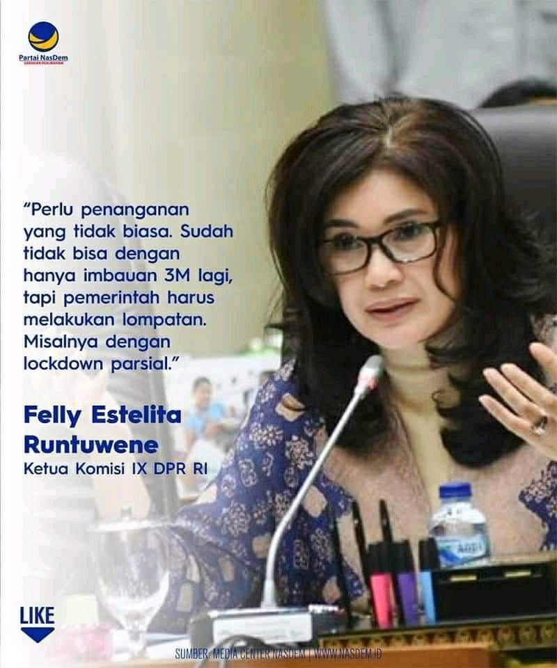 Felly Estelita Runtuwene juga menambahkan agar diperlukan penanganan yang tidak biasa karena penularan Covid 19 di Indonesia belum ada tanda-tanda penurunan kasus.