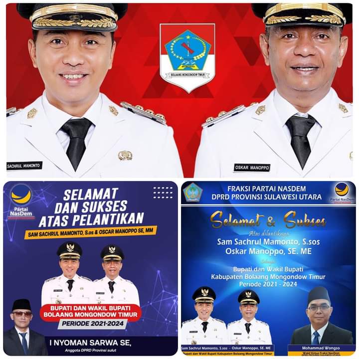 “Selamat dan sukses atas dilantiknya Sam Sachrul Mamonto-Oscar Manoppo sebagai Bupati dan Wakil Bupati Boltim periode 2021-2024,” ucap Wakil Ketua Fraksi NasDem DPRD Sulut Mohammad Wongso dan Personil Fraksi NasDem I Nyoman Sarwa yang keduanya adalah dapil BMR.