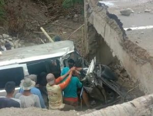 Akibat dari putusnya jalan ini, ada sebuah minibus pengantar roti terperosok di jalan itu dan pengendara mengalami luka yang serius.