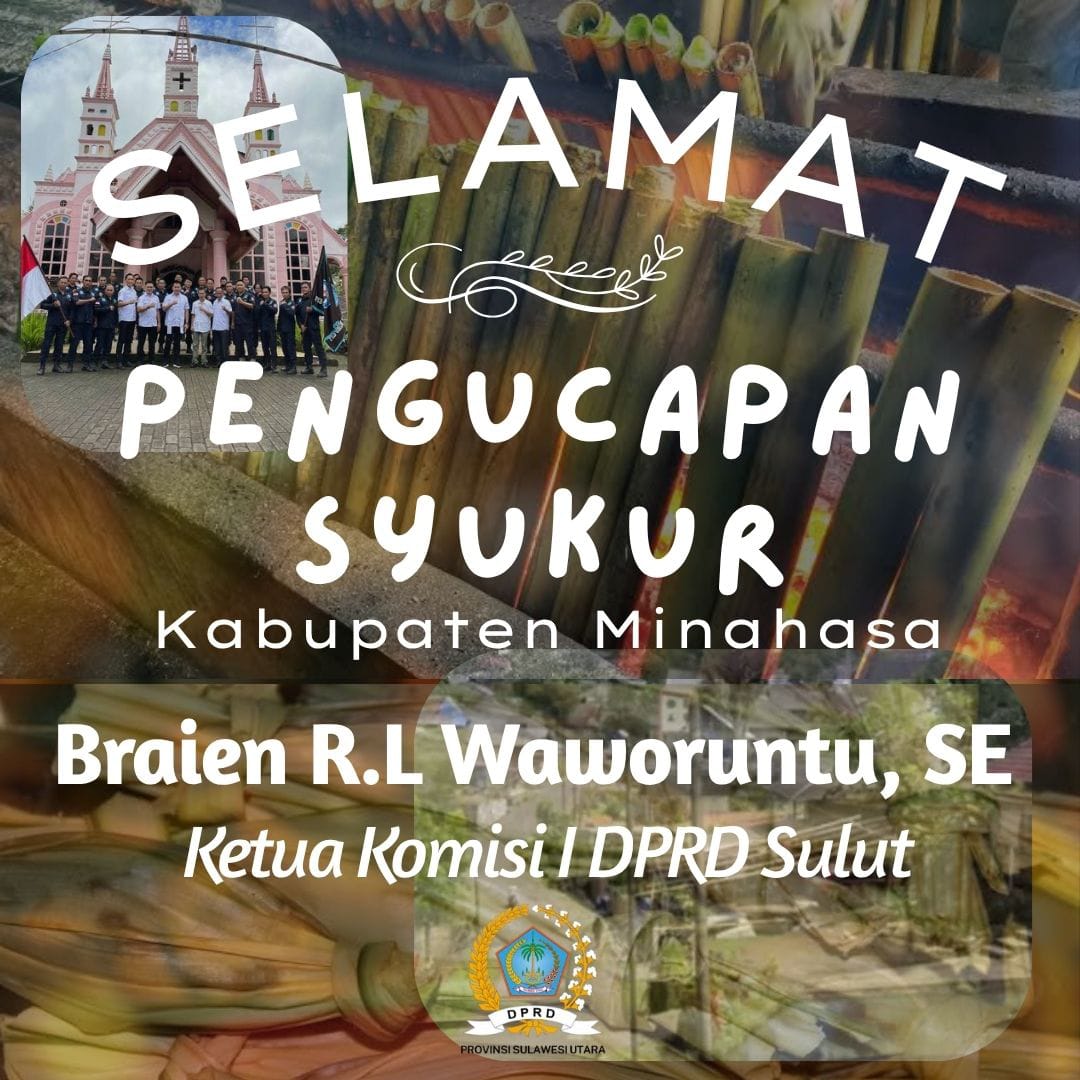 Petasulut.com, SULAWESI UTARA – Ketua Komisi I DPRD Provinsi Sulawesi Utara, Braien Waworuntu, menyampaikan ucapan selamat merayakan Pengucapan Syukur kepada seluruh masyarakat Kabupaten Minahasa.