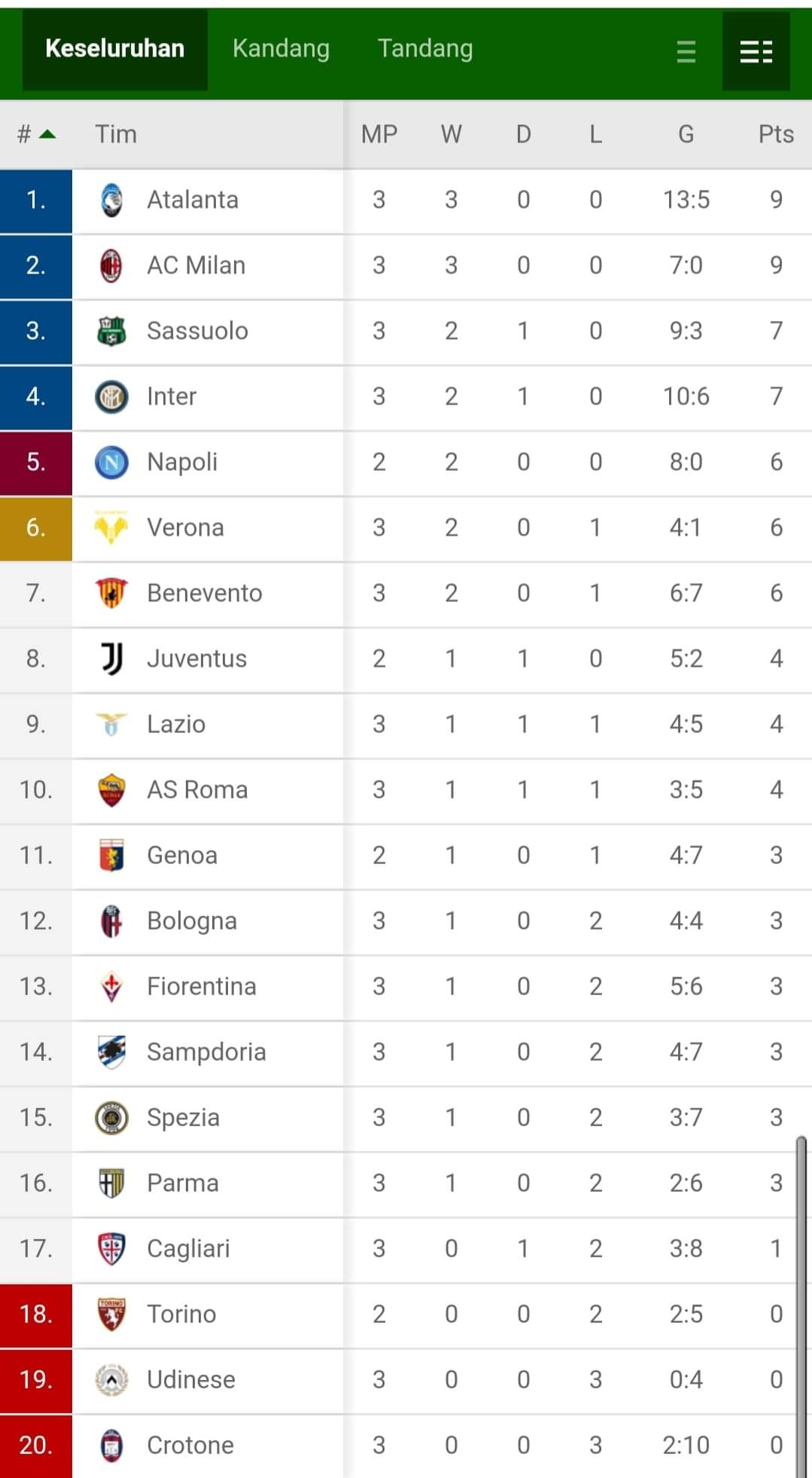 Ini dia 4 Klub yang bertengger di posisi puncak pada pekan ke-3 liga Italy 2020-2021 yakni pada posisi pertama Atalanta dengan perolehan poin 9 (main 3x), posisi kedua diduduki oleh AC Milan poin 9 kalah produktifitas Gol tandang-kandang (main 3x), ditempat ketiga dan keempat ada Sassuolo dan Inter Milan dengan perolehan sama poin 7.