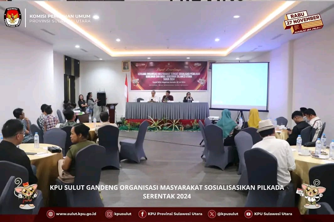 Petasulut.com, KPU – KPU Sulut kembali mengintensifkan upaya sosialisasi dengan menggelar Rapat Koordinasi Bersama Organisasi Masyarakat Sosialisasi Tahapan Pemilihan Gubernur dan Wakil Gubernur Sulawesi Utara Tahun 2024 bertempat di Hotel Grand Whizz Manado, Jumat (26/7/2024).