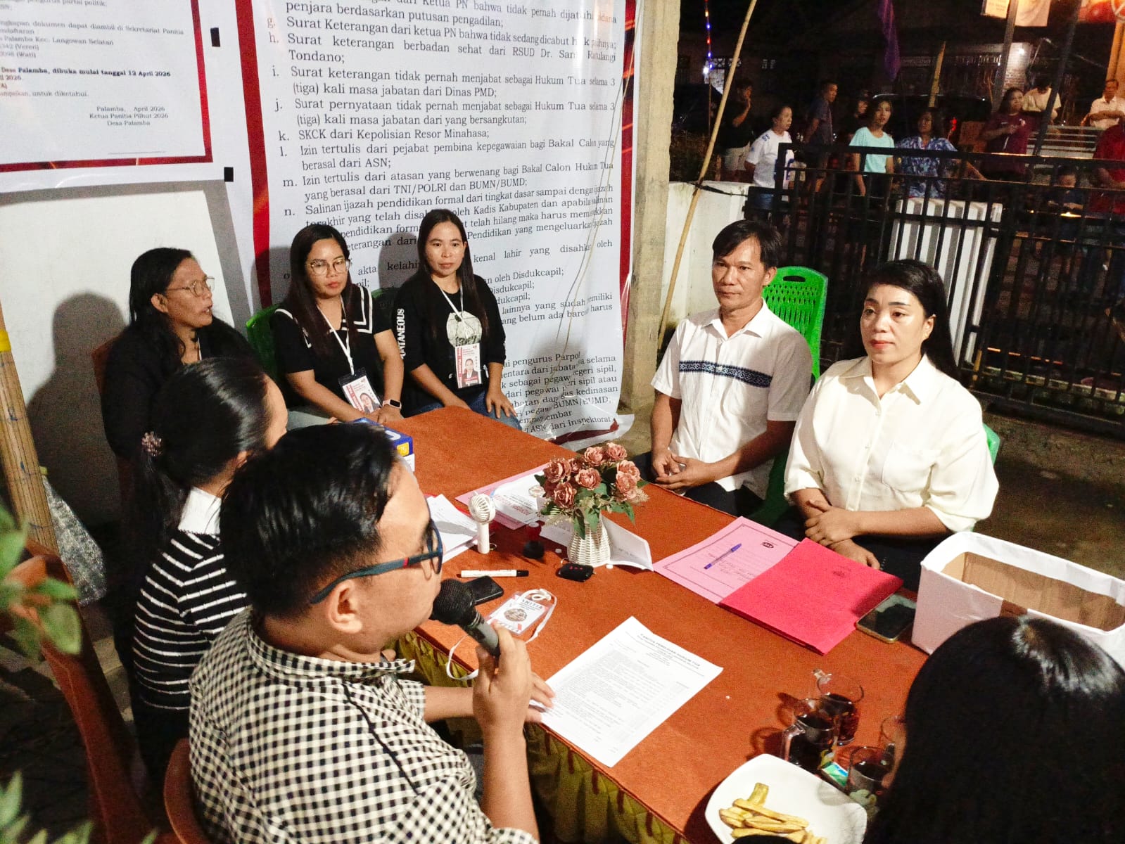 Dengan tersenyum, Syully mulai melakukan registrasi dan menyerahkan persyaratan sebagai bakal calon hukum tua di hadapan para panitia pada pukul 20.00 Wita, Sabtu (18/04/2026).