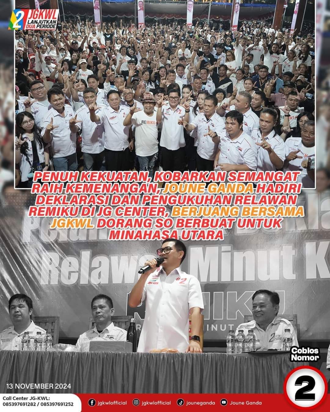 “Saya pas masuk ke sini, kaget melihat banyaknya massa pendukung yang tergabung dalam REMIKU, saya yakin dan percaya REMIKU dibawah komando Pak Theodore Lasut atau akrab disapa Lantobo akan terus mengawal saya dan Pak Kevin Lotulung pada tanggal 27 November nanti” seru JG sapaan akrab Ganda yang disambut riuh tepuk tangan ribuan massa pendukung.