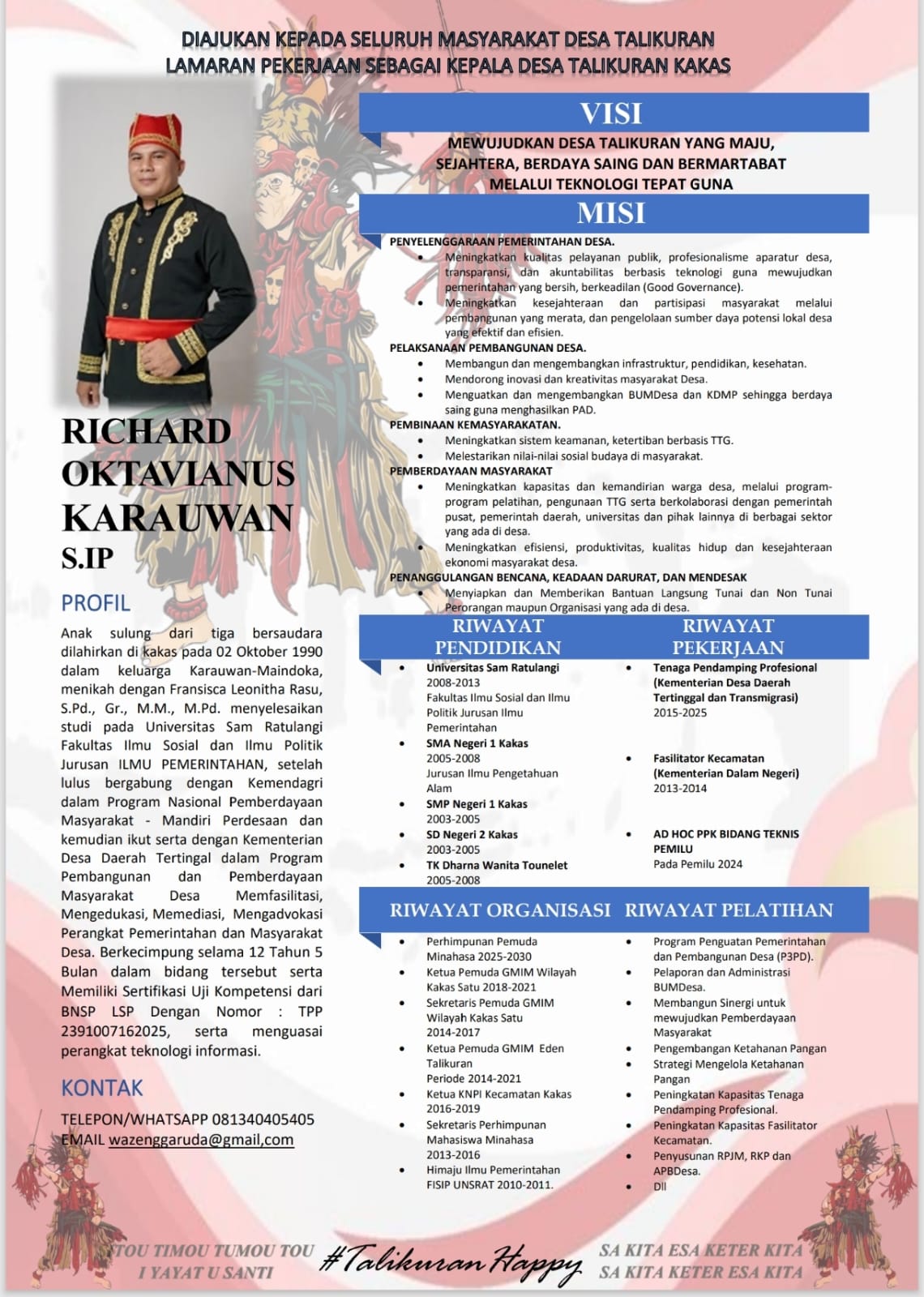 Petasulut.com, MINAHASA – Sosok muda asal Desa Talikuran, Kecamatan Kakas, Kabupaten Minahasa, Richard Karauwan, menyatakan kesiapannya untuk ikut bertarung dalam Pemilihan Kepala Desa (Pilkades) Tahun 2026. Keputusan ini diambil sebagai wujud kepedulian terhadap kemajuan desa dan komitmennya membangun masa depan Talikuran yang lebih baik.