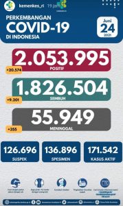Petasulut.com, NASIONAL – Kementerian Kesehatan RI kembali merilis data Covid-19 per tanggal 24 juni 2021.