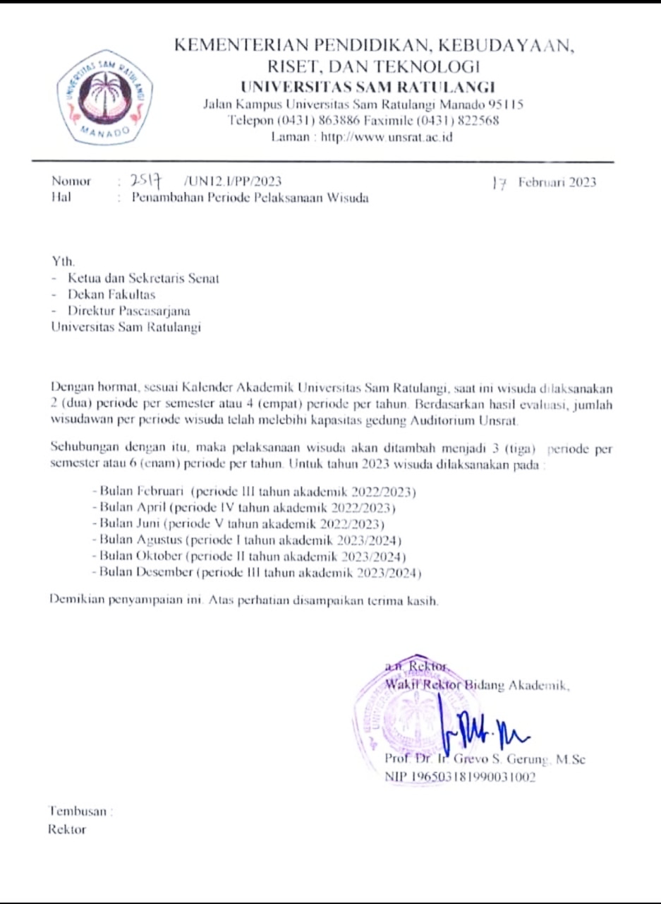 Berdasarkan hasil evaluasi, kata Grevo dalam surat resmi yang diedarkan bahwa jumlah wisudawan per periode wisuda telah melebihi kapasitas gedung auditorium Unsrat.