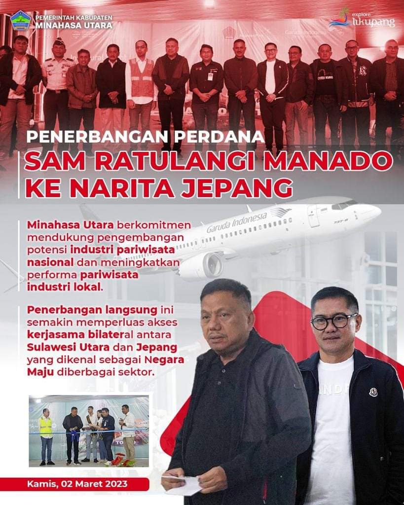 Petasulut.com, MINUT – Pemerintah telah membuka penerbangan Manado-Jepang, pada Kamis (02/03/2023). Bupati Minahasa Utara (Minut) Joune Ganda turut ikut serta bersama Gubernur Sulut Olly Dondokambey dalam penerbangan perdana ke Tokyo (Narita), Jepang.