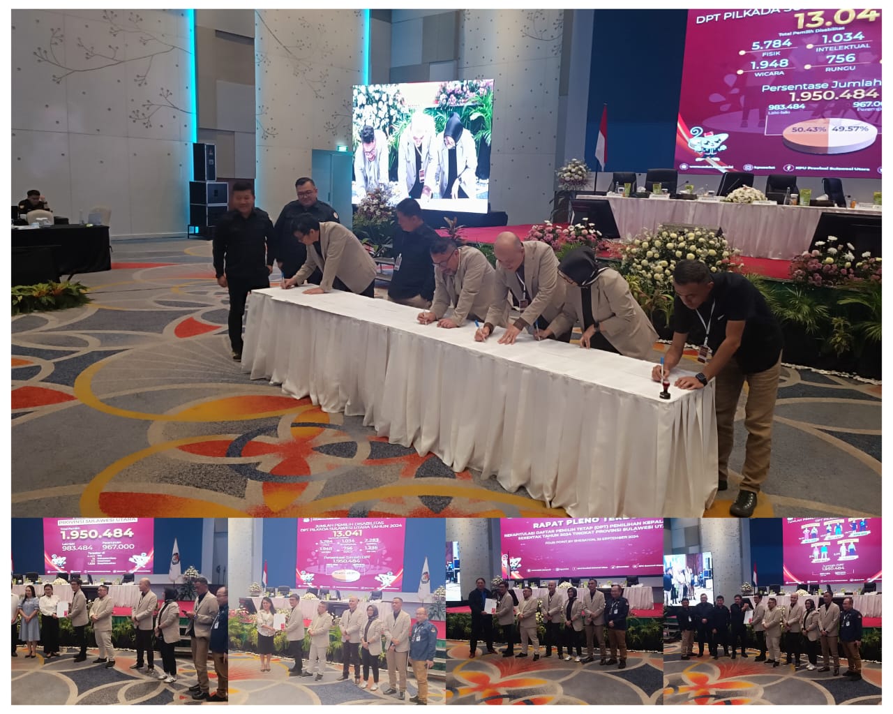 Kemudian dilanjutkan dengan Penandatangan dan penyerahan berita acara rekapitulasi DPT kepada LO tiga paslon, BIN, Polda, Dukcapil, Bawaslu Sulut.