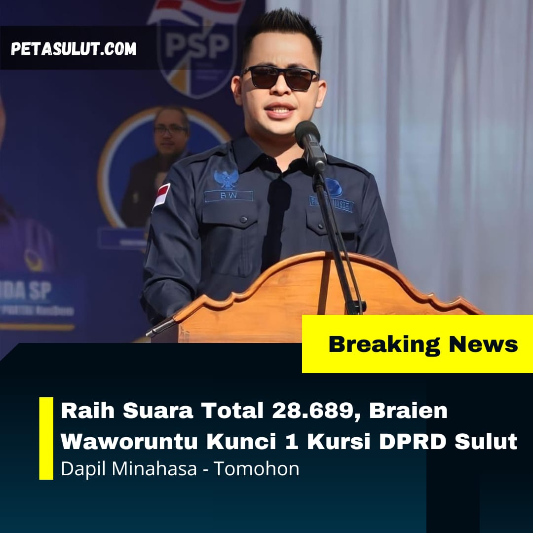 Petasulut.com, SULUT – Braien R.L Waworuntu, SE mengunci satu kursi DPRD Sulut Dapil Minahasa dan Tomohon dengan raihan total suara Nasdem mencapai 28.689 suara.