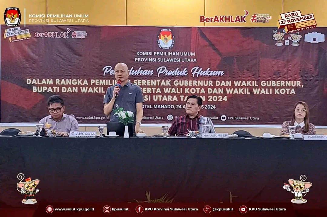 Petasulut.com, KPU – Dalam rangka penyamaan persepsi produk hukum dalam Pemilihan Serentak Gubernur dan Wakil Gubernur, Bupati dan Wakil Bupati, serta Wali Kota dan Wakil Wali Kota di Sulawesi Utara tahun 2024, KPU Sulut menggelar penyuluhan produk hukum kepada stakeholder di wilayah Kota Manado.